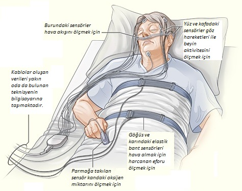 Horlama, uykuda nefes durması (apne), gündüz aşırı uykululuk hali yakınmaları ile başvuran hastalara polisomnografi adı verilen uyku tetkiki yapılmaktadır. Bu uygulama solunum, beyin aktivitesi, nabız, kalp ritmi, vücut hareketleri, kanda bulunan oksijen düzeyi ilk sıralarda olmak üzere tüm gece boyunca meydana gelen aktivitelerin kaydedilmesi işlemlerinden oluşur. Polisomnografi tüm gece boyunca kişinin uykuda olduğu esnada vücut ve beyindeki sistemlerin, yüz, kafa ve vücuda konulan sensörlerin yardımı ile yapılır. Hastanın test önceki uyku ilacı almadan ve önceki günden uykusuz bir şekilde gelmesi önerilir.
